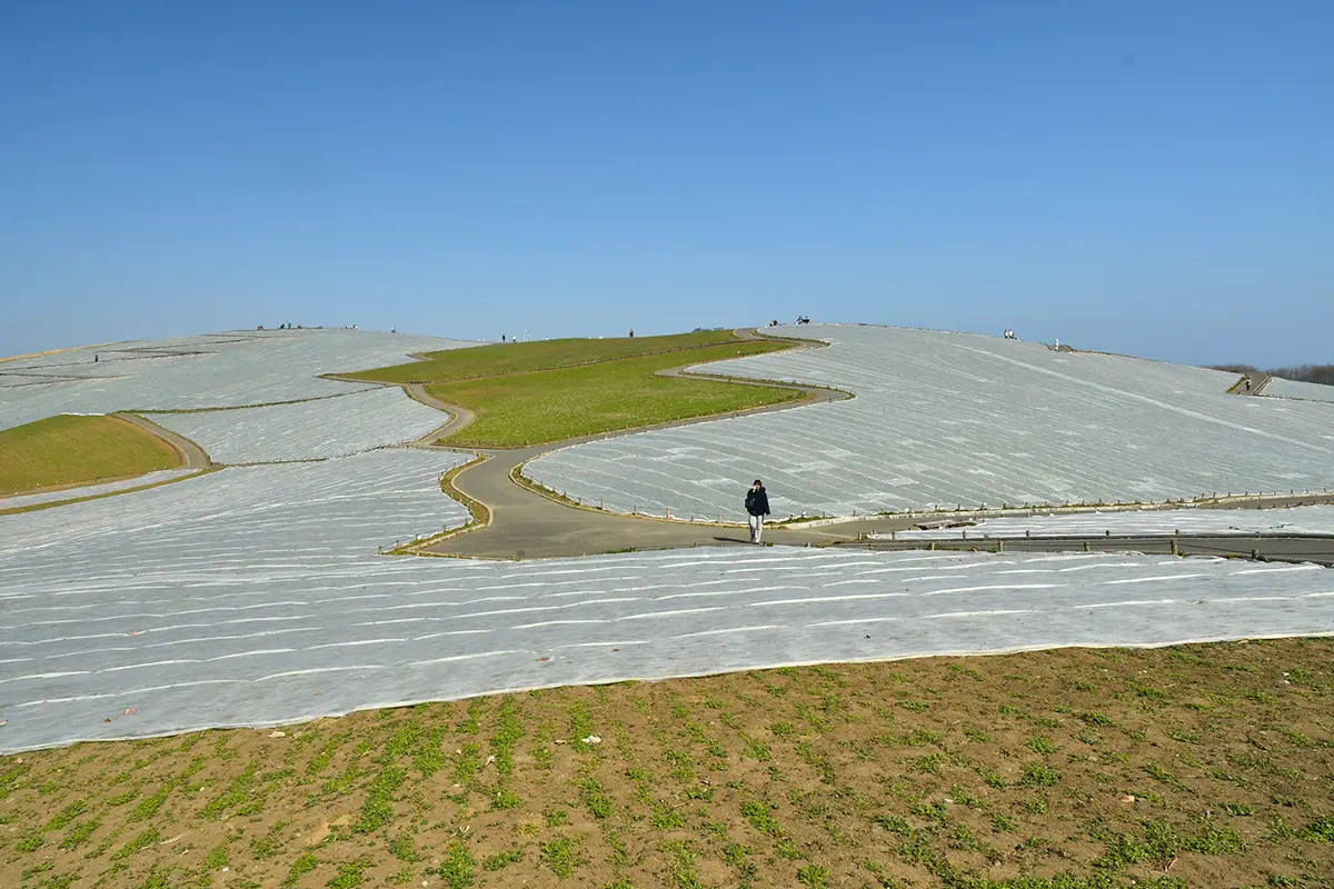 国営ひたち海浜公園のネモフィラが開花準備を初めている。約530万本が咲き誇る4.2haの「みはらしの丘」では、2月10日から霜よけシートの撤去が始まった。入園料は見頃期間中800円、駐車場600円。撤去作業は2月26日に完了予定、この時期だけ見られる準備風…