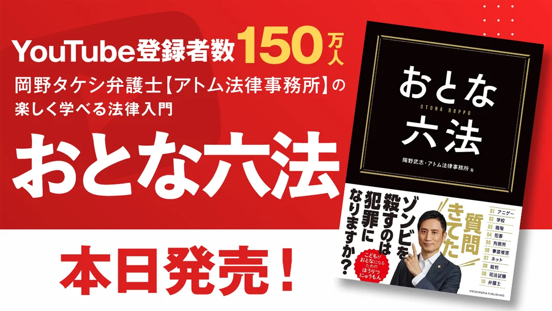 発売前重版で話題の法律入門書ついに発売!!日本一の弁護士YouTuber・岡野タケシ弁護士が本気で執筆!大人も子どもも楽しく法律を学べる『おとな六法』本日発売!!