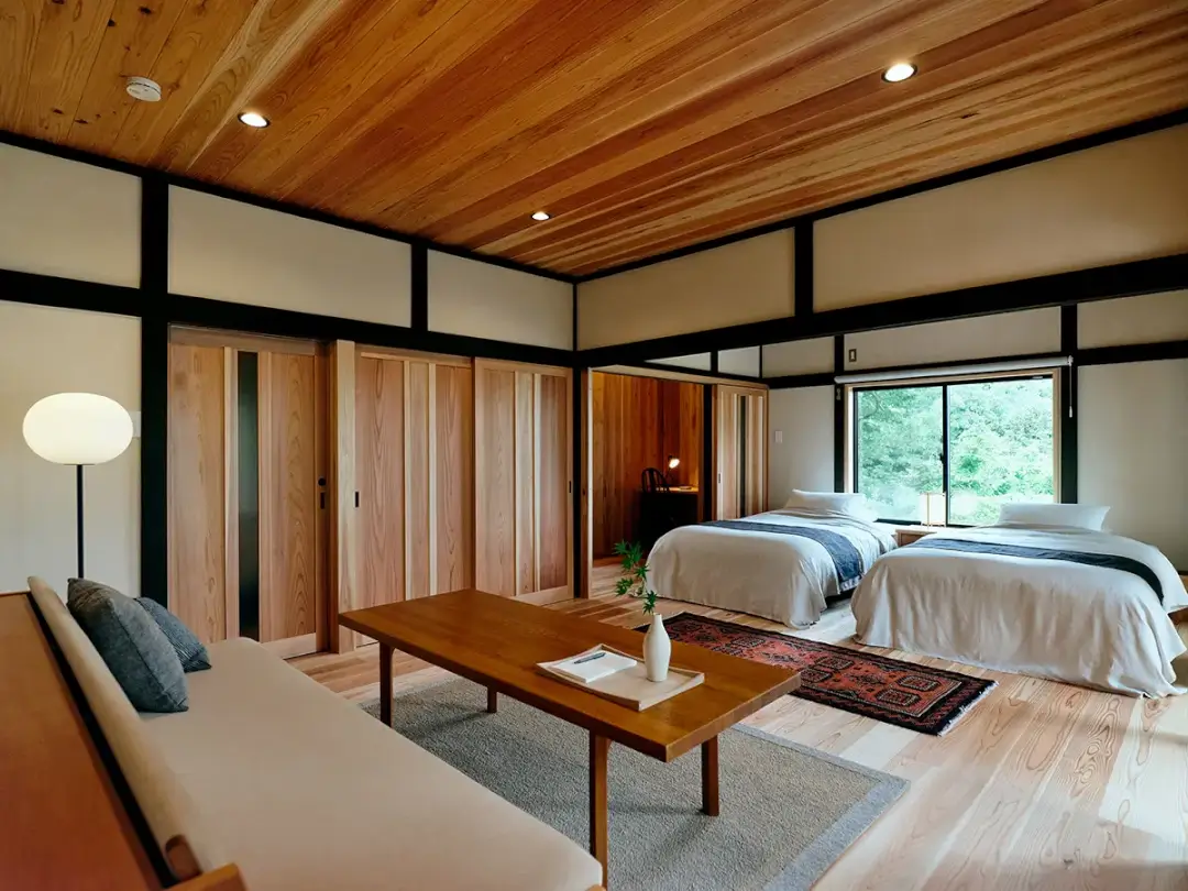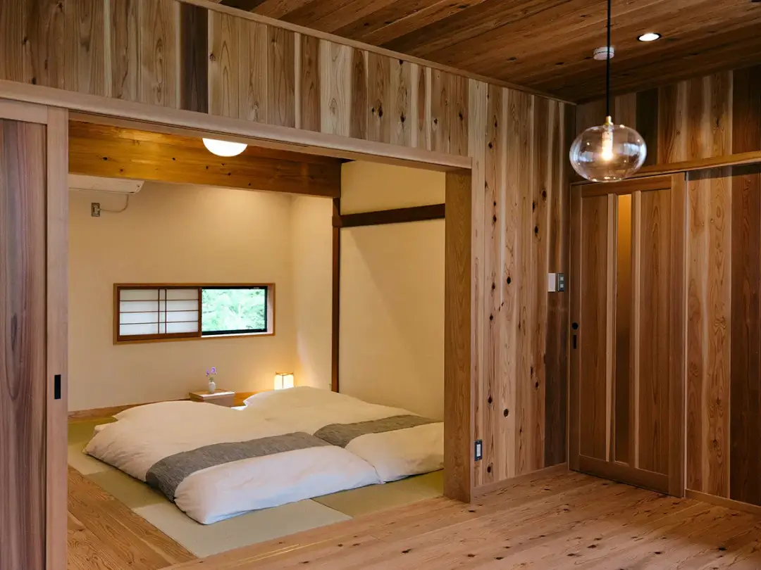 水郷筑波国定公園 第2種特別保護地域内にあたる、霞ヶ浦湖畔の高台に位置する1棟貸しの宿、水郷園。昭和期に建てられた旧家を、日本の伝統構法である板倉構法で再生した建物は、時を経るごとに味わいを増していきます。窓辺や庭先から望むのは、日本で2番目に大きな湖、霞ヶ浦。早朝、天気が良ければ広大な湖の水平線にのぼる朝日を見ることもできます。