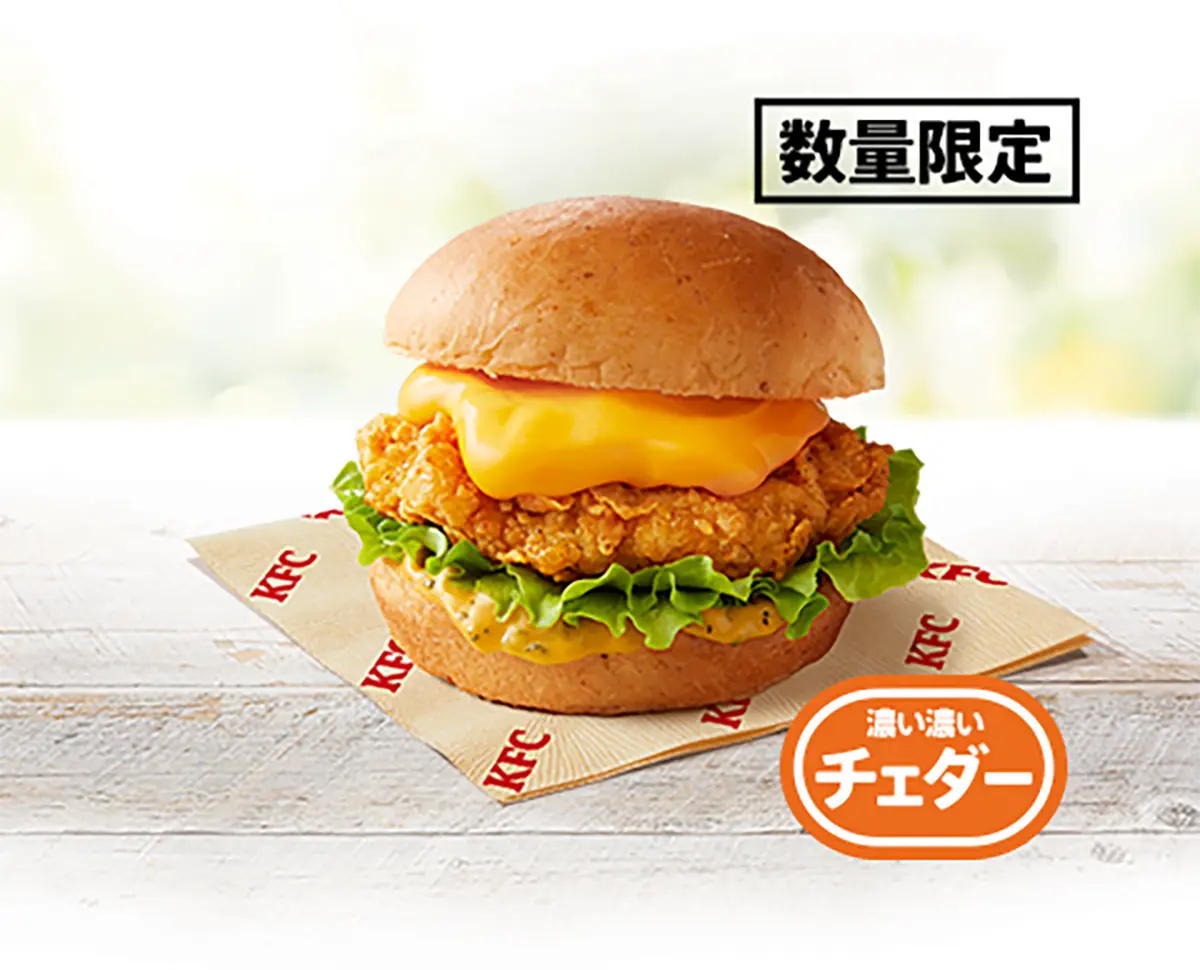 定番の「チーズにおぼれるフィレバーガー(濃い濃いチェダー)」は、KFC自慢のやわらかくジューシーなチキンフィレと相性抜群のチェダーチーズソースを使用する。重量感と濃厚なコクが特徴で、とろ~りとあふれるチーズの存在感を存分に味わえる一品だ。