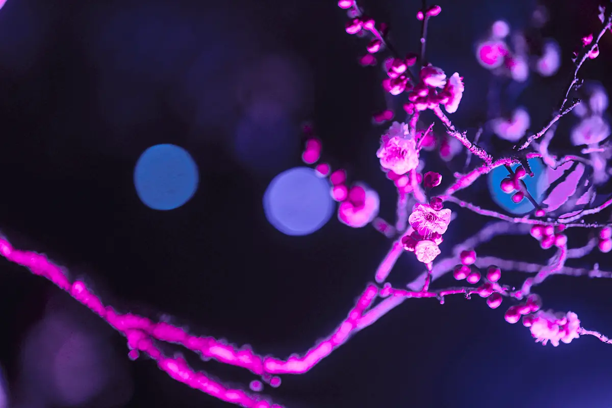 色彩監修を担当したのは山科言親氏。1000年続く伝統色の中から、夜の梅林に映える色を厳選した。光のレイヤーが重なり合う様は、着物の襲ね(かさね)の美学そのものだ。