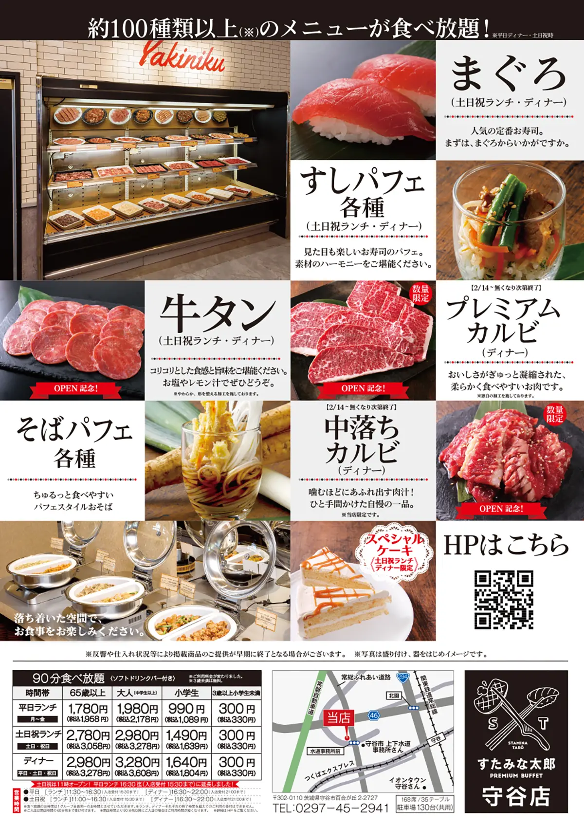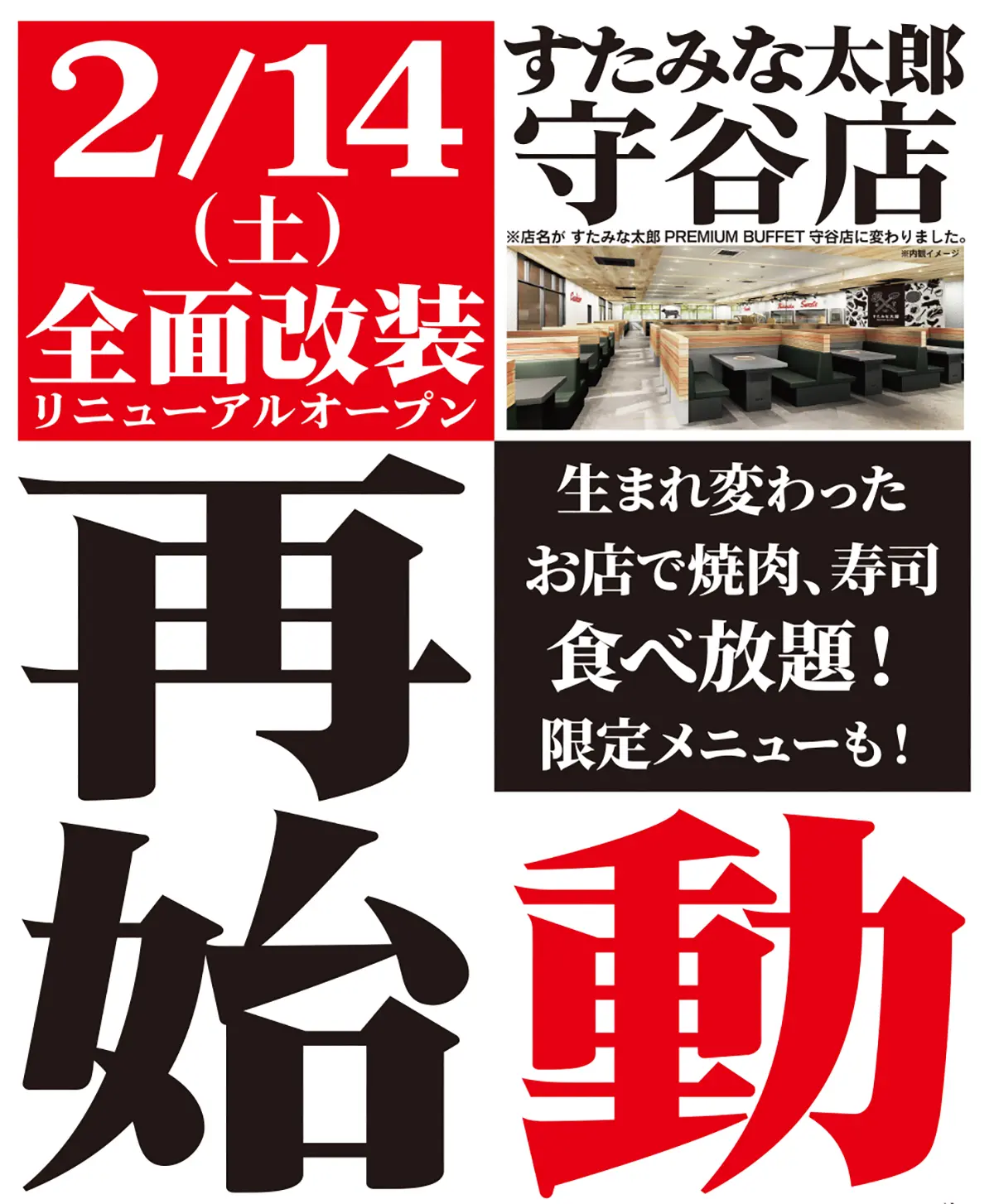 株式会社江戸一が運営する「すたみな太郎 守谷店」が、2026年2月14日に「すたみな太郎 PREMIUM BUFFET守谷店」として全面改装オープンする。木目を基調にした168席の店内では、中落ちカルビやプレミアムカルビなど数量限定メニューが食べ放題だ。ディナー料金は税込3,608円、PREMIUM BUFFETブランドとしては23店舗目の出店となる。