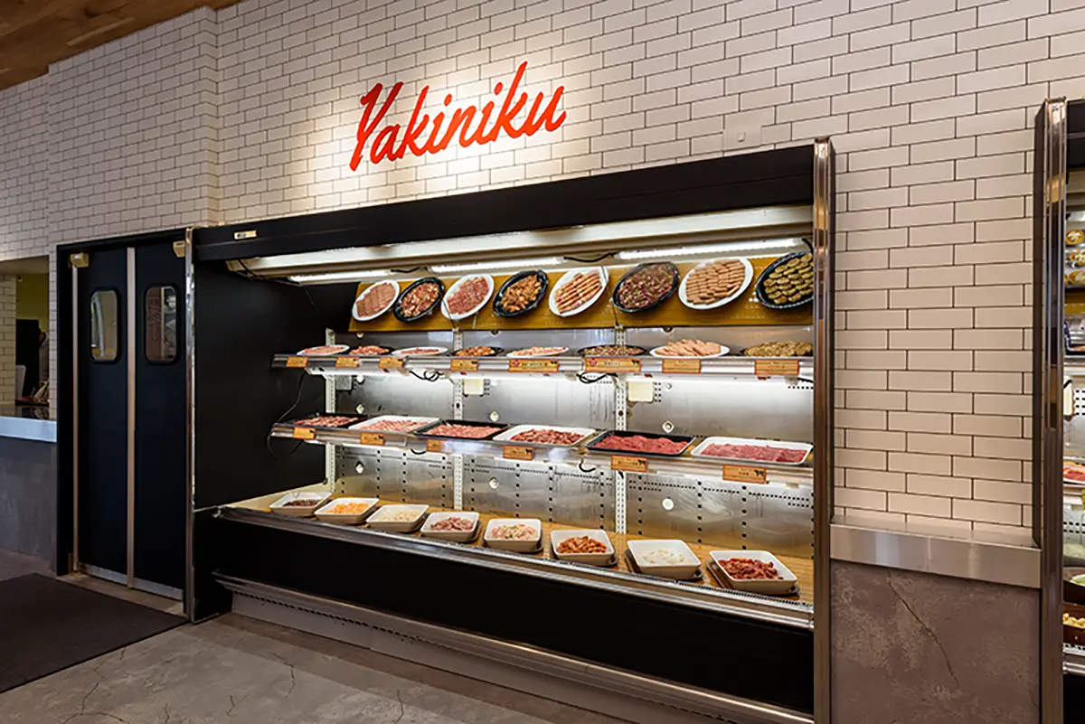 店内は木目を基調とした天井と敷居、グリーンのソファーで構成される。森の中で食事をしているような空間を実現した内装だ。168席を確保し、130台分の共用駐車場を備える。焼肉コーナー、寿司コーナー、スイーツコーナーを配置し、家族連れでも使いやすい動線を確保した。