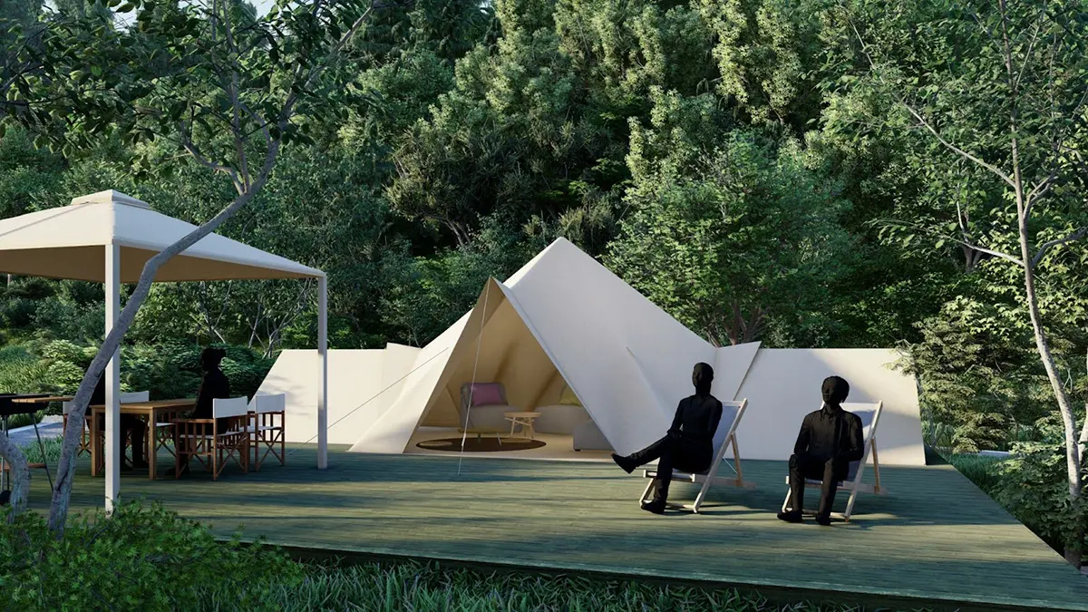 森の谷にある、自然と一体化して過ごせるグランピング。