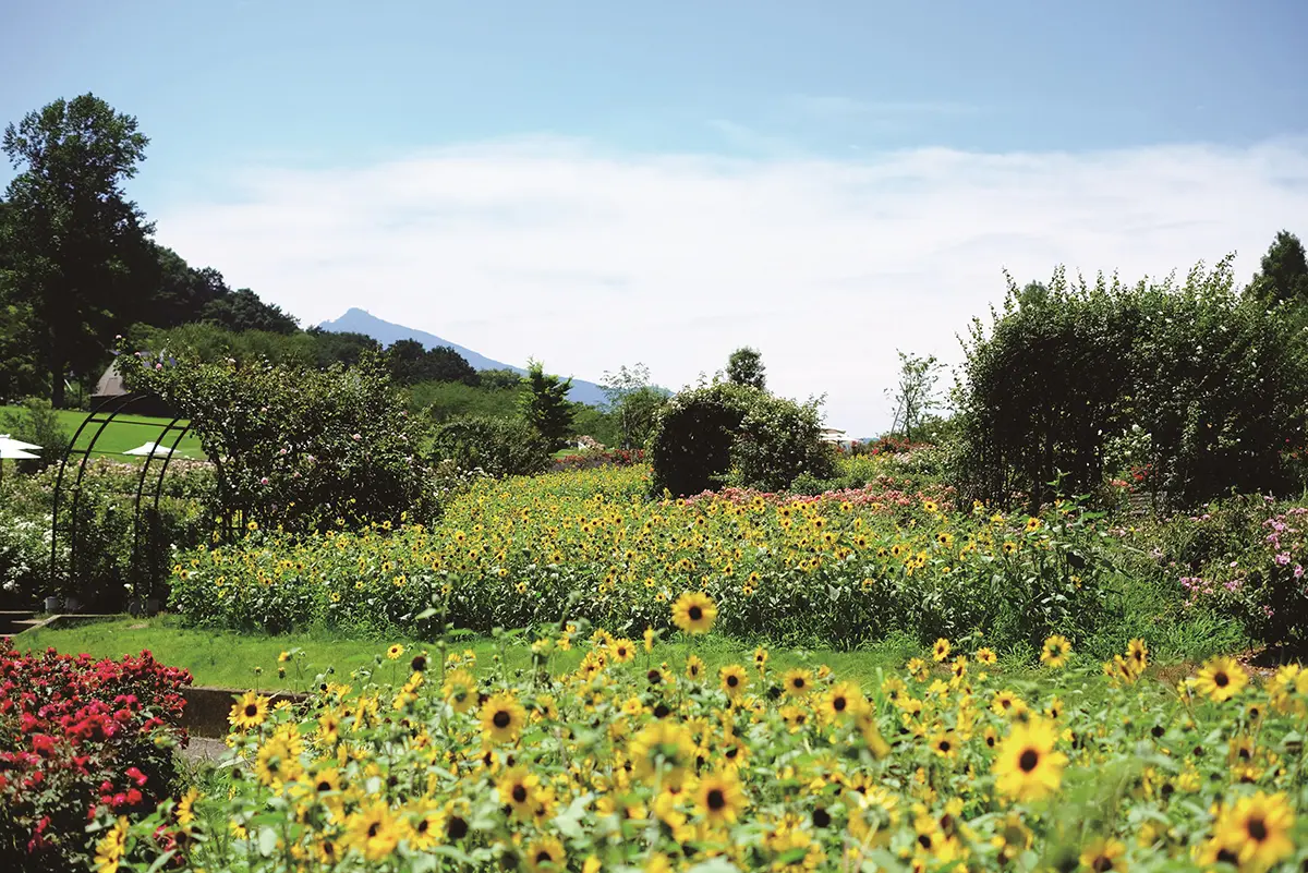 都心から車で約90分のいばらきフラワーパーク(https://www.flowerpark.or.jp/)。筑波山麓ののどかなこの地は、「にほんの里100選」にも選ばれ、ほっとするような里山の風景が広がっています。サマーローズが咲くバラテラスには、小ぶりで可愛いヒマワリが「花の川」として咲き誇り、夏の陽ざしを浴びてキラキラと輝いています。