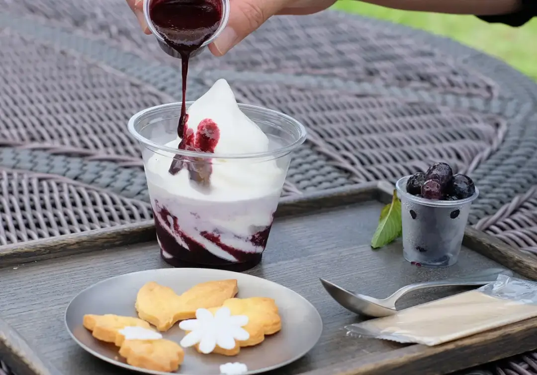 茨城ミルクのソフトクリームに自分で葉っぱのクッキーや果物、ソースをトッピング!
