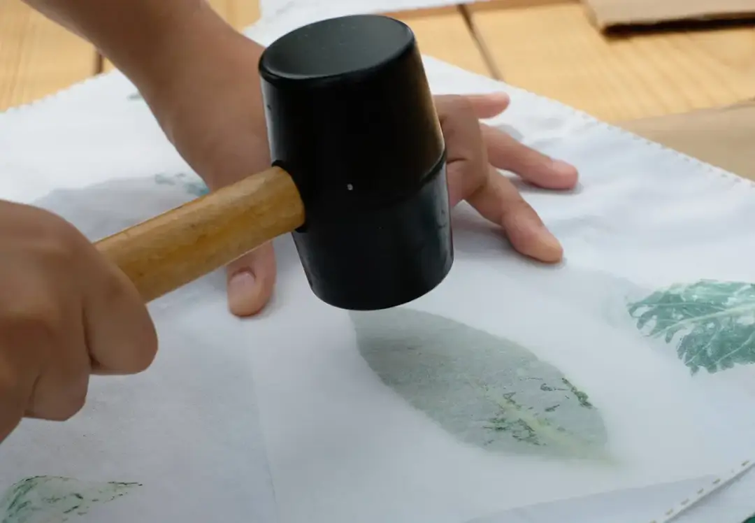 ハンカチに葉っぱやお花など植物を置いて、トントン叩いて自分だけのたたき染めの作品を作ろう