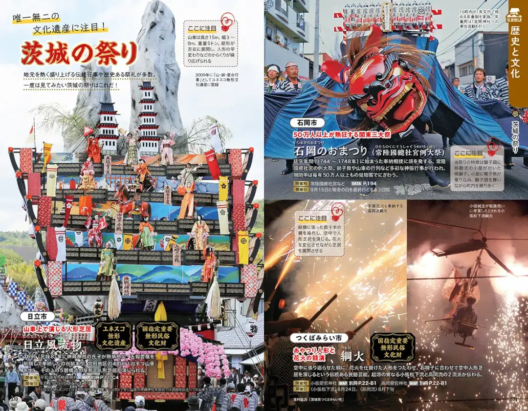 別冊地図付きで、500ページに600軒以上のスポットを紹介。グルメや買い物などの王道特集だけでなく、茨城を変えたプロジェクトや歴史年表、伝統文化、各地のお祭りやイベントなど、茨城県のすごい魅力をたっぷり詰め込みました。