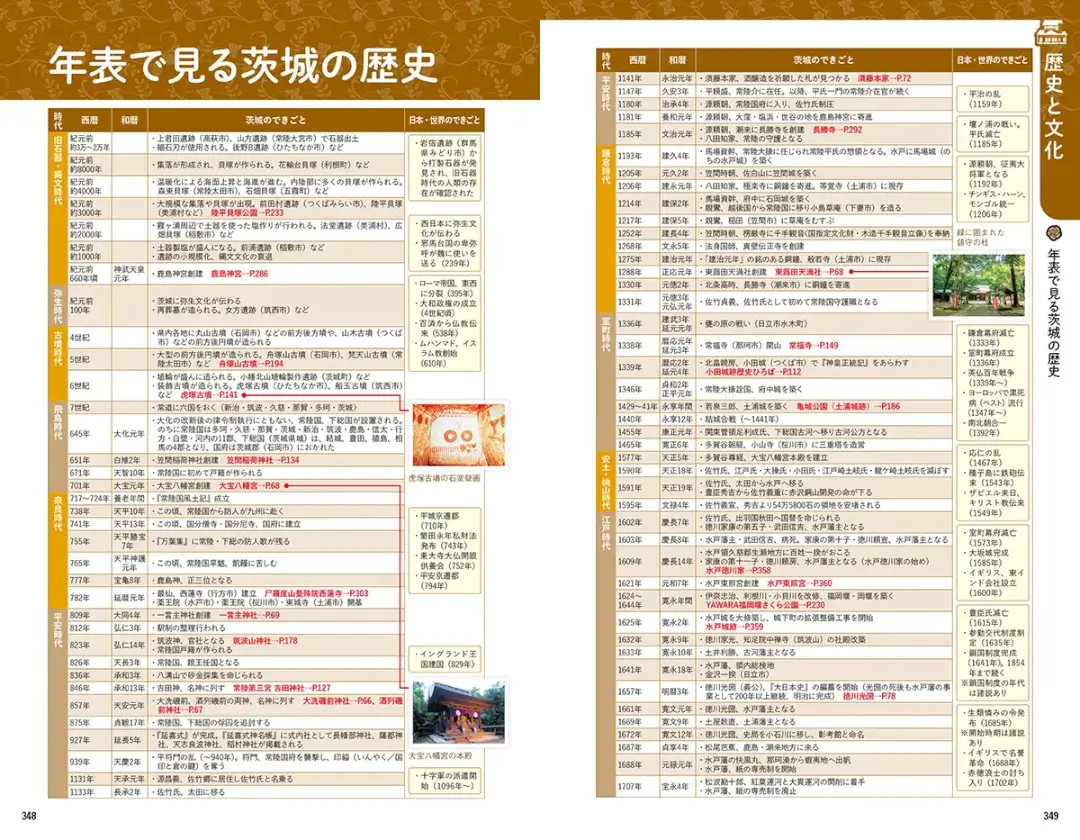 「地球の歩き方」国内版シリーズは、流行り物を極力そぎ落とし、地元の方にとっても新たな発見があるように、歴史や伝統・文化の特集を充実させています。茨城県の歴史年表は、本書掲載の店や観光スポットにもリンクしているので、歴史の舞台を歩くことも可能! 茨城県民やゆかりの500人に聞いた「あるあるネタ」やクチコミ情報も見逃せません。