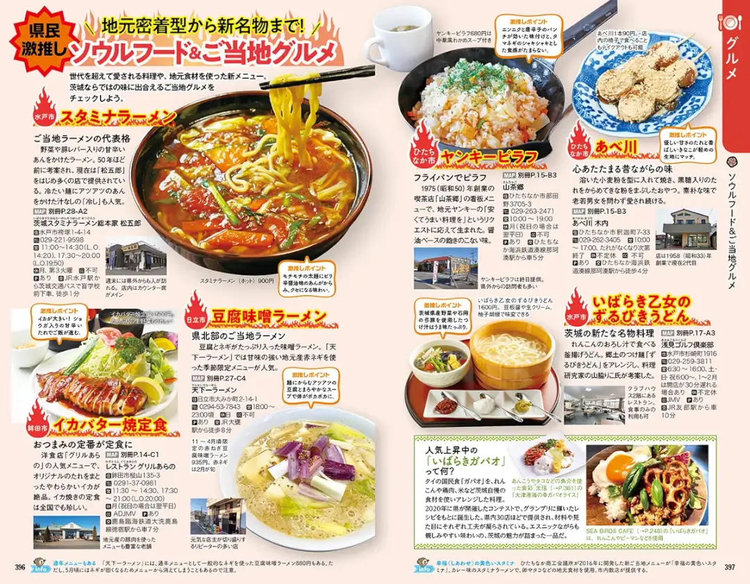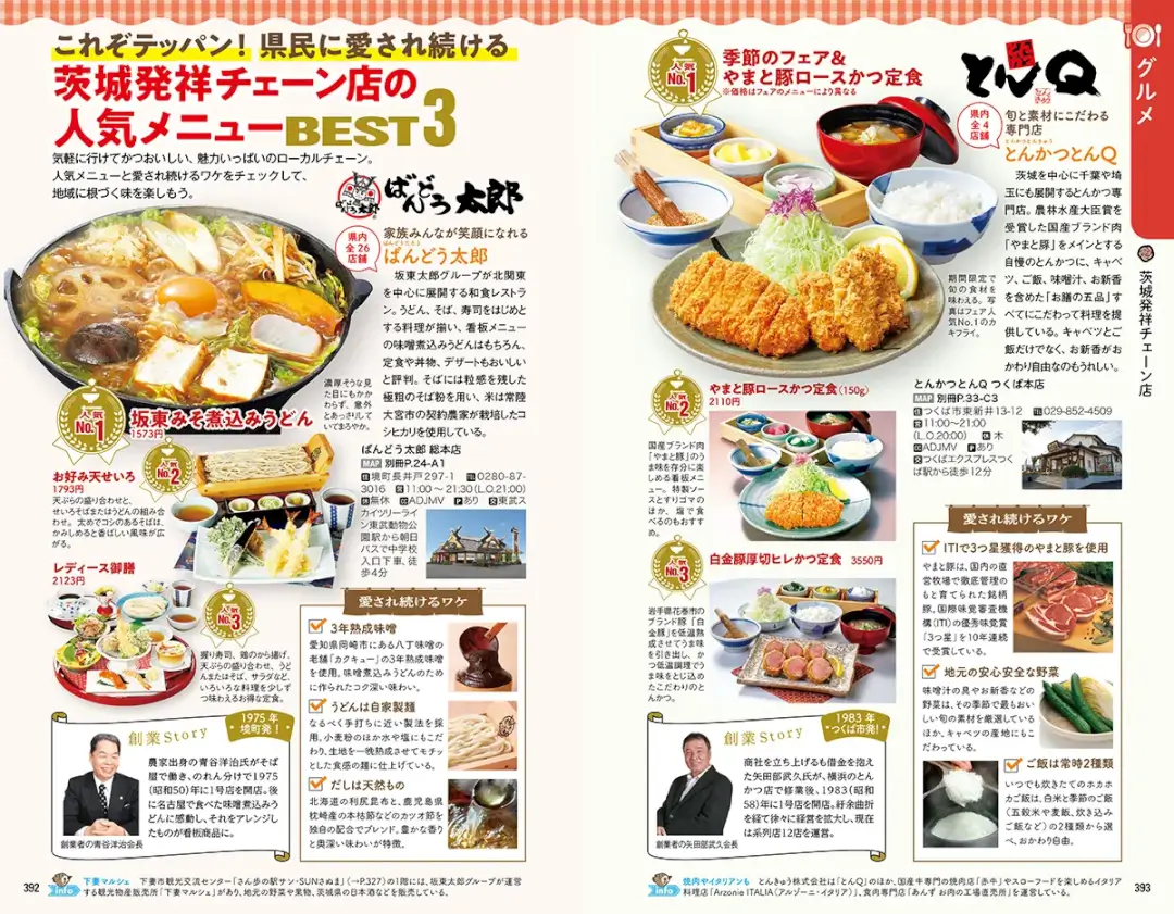 県民にはおなじみの地元グルメからブランド肉、県を代表する高級魚あんこう、魚市場、茨城が世界に誇る国民食・納豆、農業産出額全国1位のさつまいもや県民のおやつ・ほしいもまで大集合。ばんどう太郎やココス、ラーメン山岡家など、茨城発祥チェーン店の必食メニューを徹底リサーチした特集も必見です。
