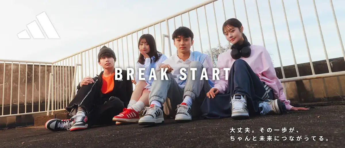 アディダスの新作スニーカー『BREAK START』が登場!現役高校生シンガーソングライターAKASAKIとのタイアップで、新たな一歩を踏み出す若者を応援するキャンペーンを展開中。80年代のレトロデザインと現代の機能性を融合した一足であなたも新しいスタートを!