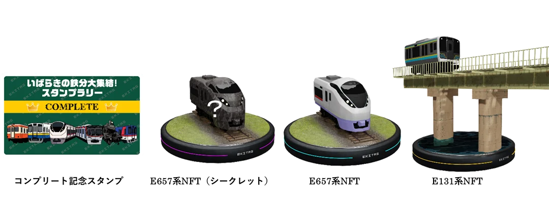 スタート駅のスタンプとゴール駅のいずれかのスタンプを1つ取得すると路線に応じた記念スタンプをプレゼント(自動付与)。さらに抽選でその路線に応じたオリジナルNFTを全9種各10名様にプレゼント。