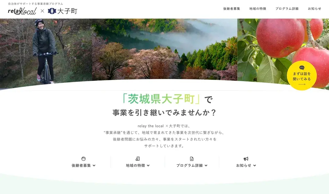 これに対して大子町とrelayは、移住・定住を伴う第三者事業承継の推進に向けて、大子町と共に取り組んでまいります。連携の第一弾として、大子町に特化した後継者募集案件を掲載した「relay the local 大子町」を開設しました。今後、大子町に相談が寄せられる後継者不在事業者の情報をrelayに提供いただき、「relay the local 大子町」への掲載を行います。