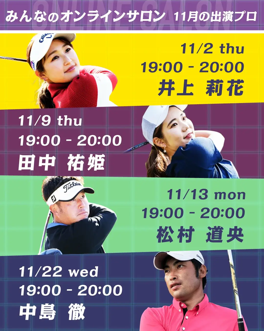 サービス開始初月となる11月は、ゴルフルアンバサダーの井上莉花さんをはじめ、JLPGAティーチングプロの田中祐姫プロ、男子ツアーを主戦場に戦う松村道央プロ、中島徹プロの4名に登場頂き、会員メンバーの皆様に各プロ珠玉のアドバイス、上達に繋がる様々なお話しをして頂く予定です。