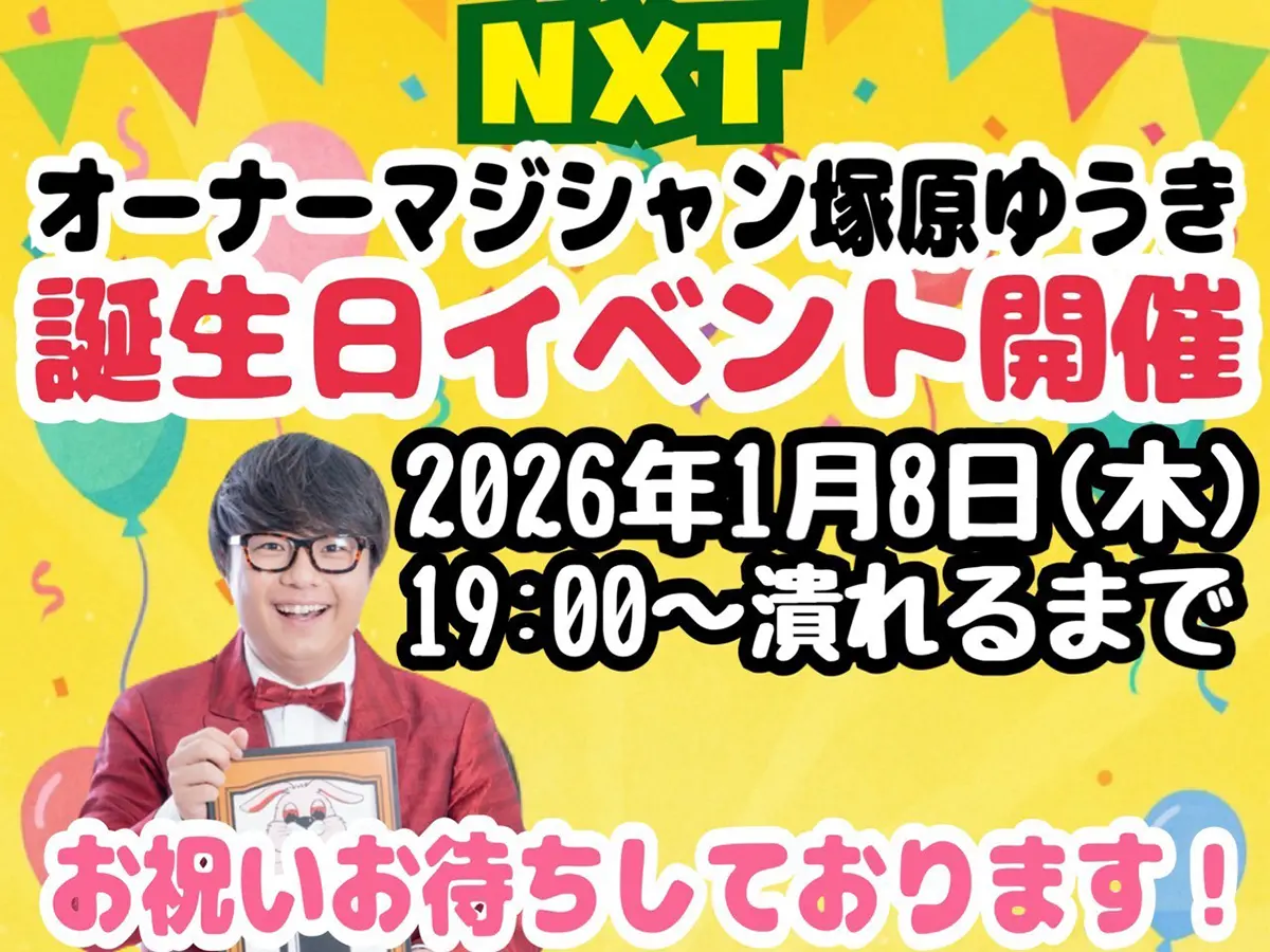茨城県土浦市に「MAGIC BAR NXT(マジックバー ネクスト)」という店がある。マジック、生バンドカラオケ、シーシャを組み合わせた複合型のエンタメバーだ。2026年1月8日、オーナーマジシャン・塚原ゆうき氏の誕生日イベントを開催する。